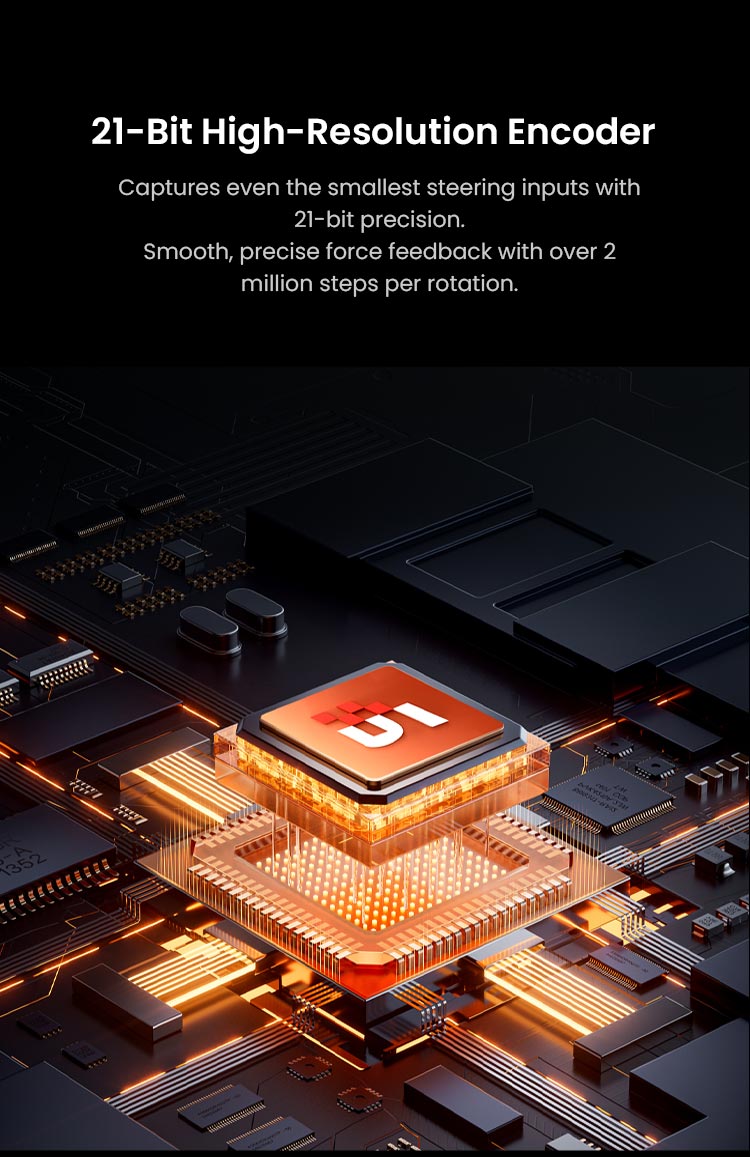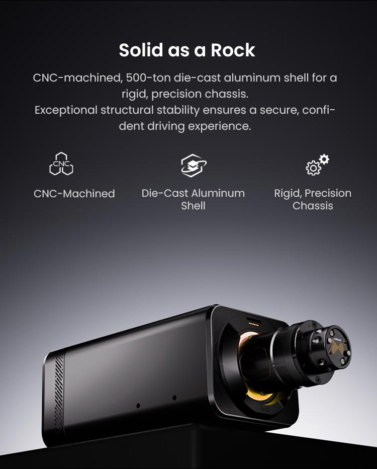 Das aus Aluminiumguss gefertigte und CNC-gefräste Chassis bietet eine robuste und stabile Struktur, die auch intensiven Fahreinsätzen standhält, ohne an Präzision einzubüßen. In Kombination mit dem 21-Bit-Encoder erfasst das System selbst kleinste Lenkradbewegungen und sorgt so für ein extrem natürliches und detailreiches Fahrgefühl.