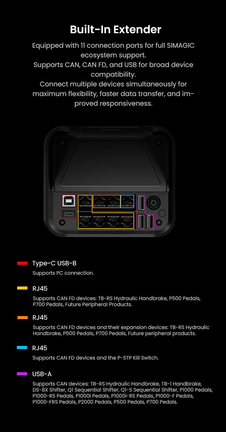 Dank seiner Architektur mit CAN, CAN FD und USB ermöglicht diese Basisstation den Anschluss mehrerer Peripheriegeräte und Zubehörteile aus dem Simagic-Ökosystem und von Drittanbietern.