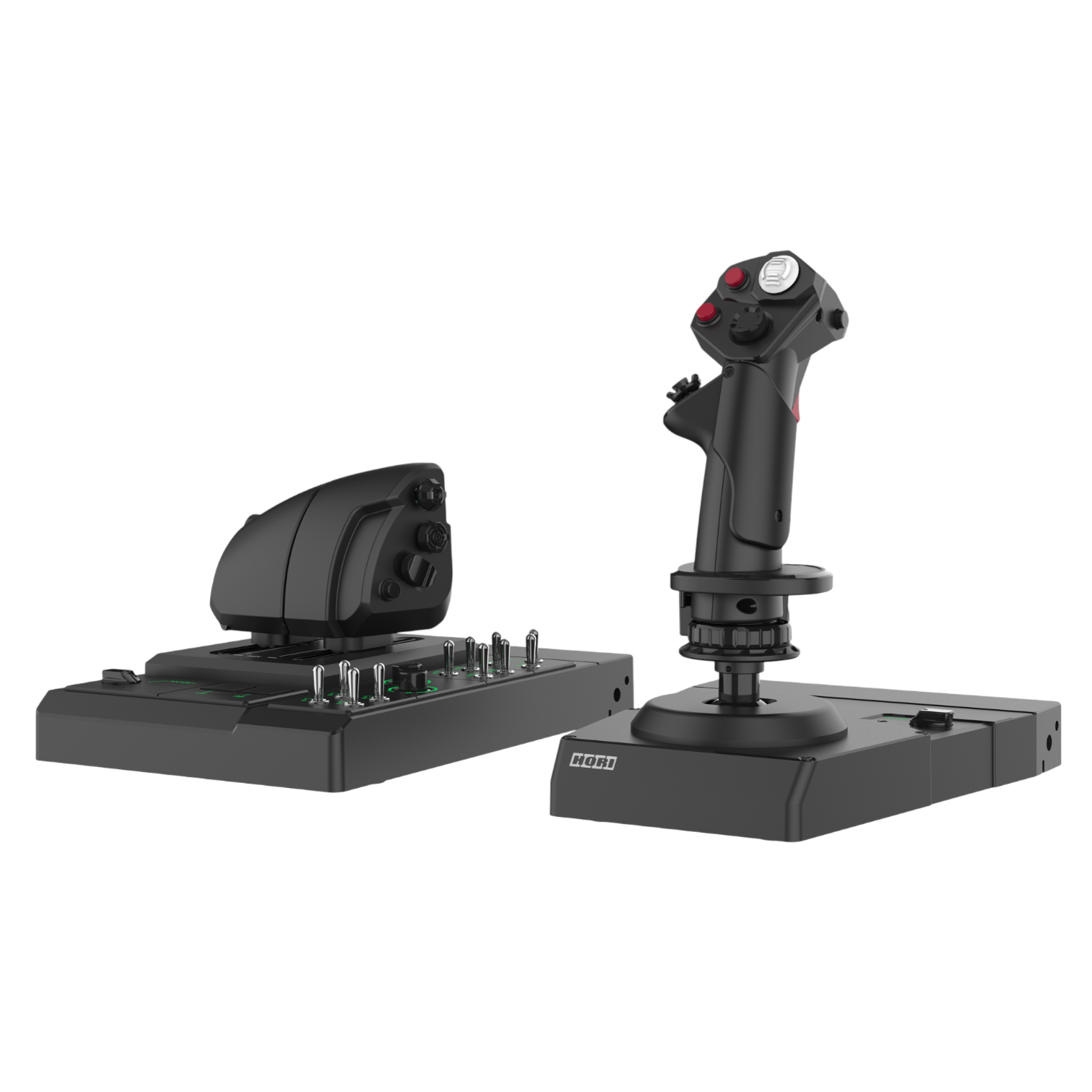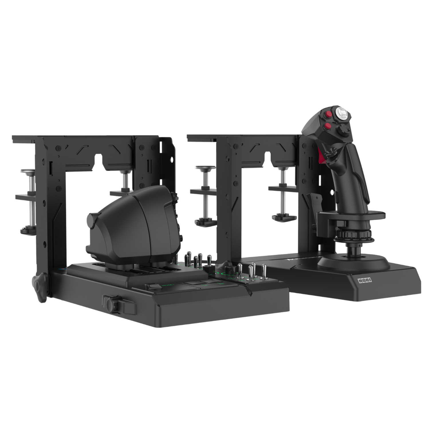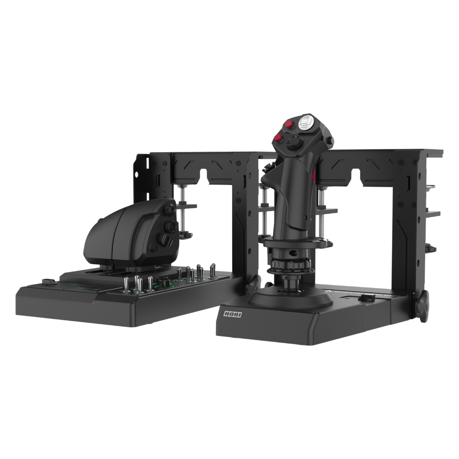 The HORI HOTAS Flight Control System & Mount is a high-end flight control system designed for those seeking a serious flight simulation experience , with a realistic layout and an uncommon level of customization. It combines independent joysticks and throttles with a fully adjustable steel desktop stand to recreate an authentic cockpit position, whether mounted side-mounted or center-mounted.