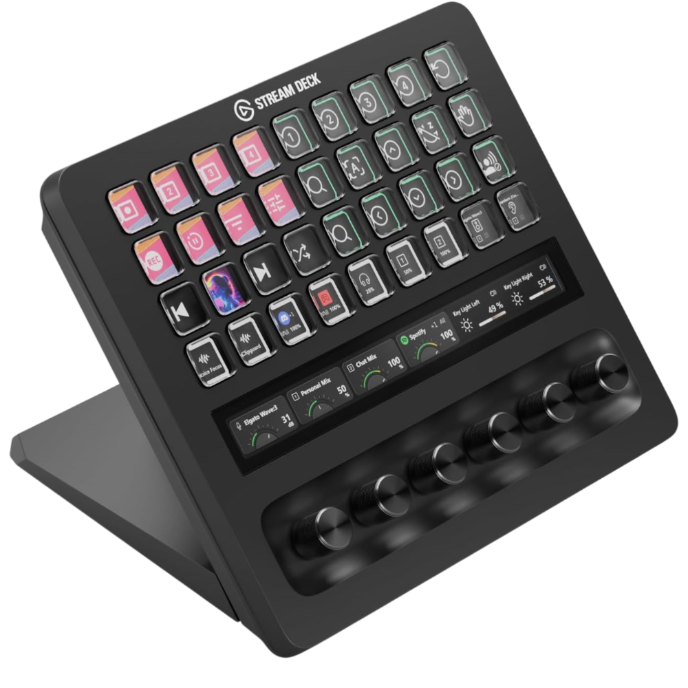 El Stream Deck + XL es una superficie de control profesional diseñada para gestionar flujos de trabajo exigentes con rapidez y precisión. Con 36 teclas personalizables, diales intercambiables y una barra táctil LCD, este controlador centraliza decenas de acciones en una sola interfaz intuitiva.