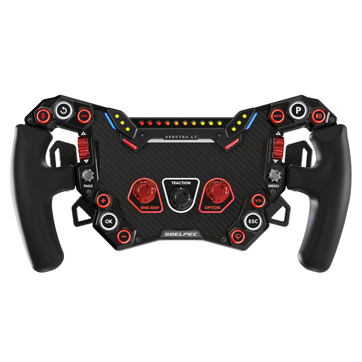 El SOELPEC Spectra LT es un volante de simulación de carreras diseñado para quienes buscan precisión, personalización y una estética única. Con una estructura robusta de aluminio anodizado y una placa central de fibra de carbono, este volante se posiciona como una herramienta de alto rendimiento en el mundo del simracing profesional. Su diseño ergonómico y su espectacular iluminación RGB lo convierten en una pieza tan funcional como visualmente impresionante.